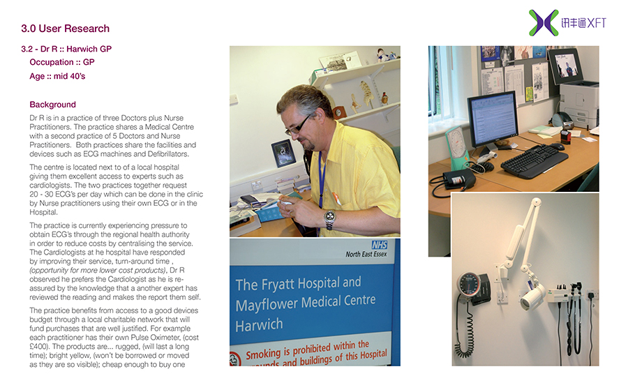 在医疗领域,产品的使用环境极其复杂,包括医疗与非医疗环境,前者又分急救、社区等不同等级的医疗环境。了解产品使用环境的同时,还要了解医疗流程评估其效率,使得新产品更好地适应不同医疗环境下的医疗流程,进而优化这些流程、让其变得更简单、更直观。